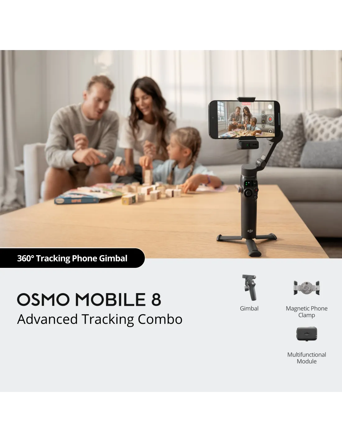 DJI Osmo Mobile 8 – pažangus išmaniojo telefono gimbalas su 3 ašių stabilizacija, 360° sekimu ir integruotu prailginamu laikikliu. Puikus pasirinkimas vlogams, socialinių tinklų turiniui ir profesionaliems video.