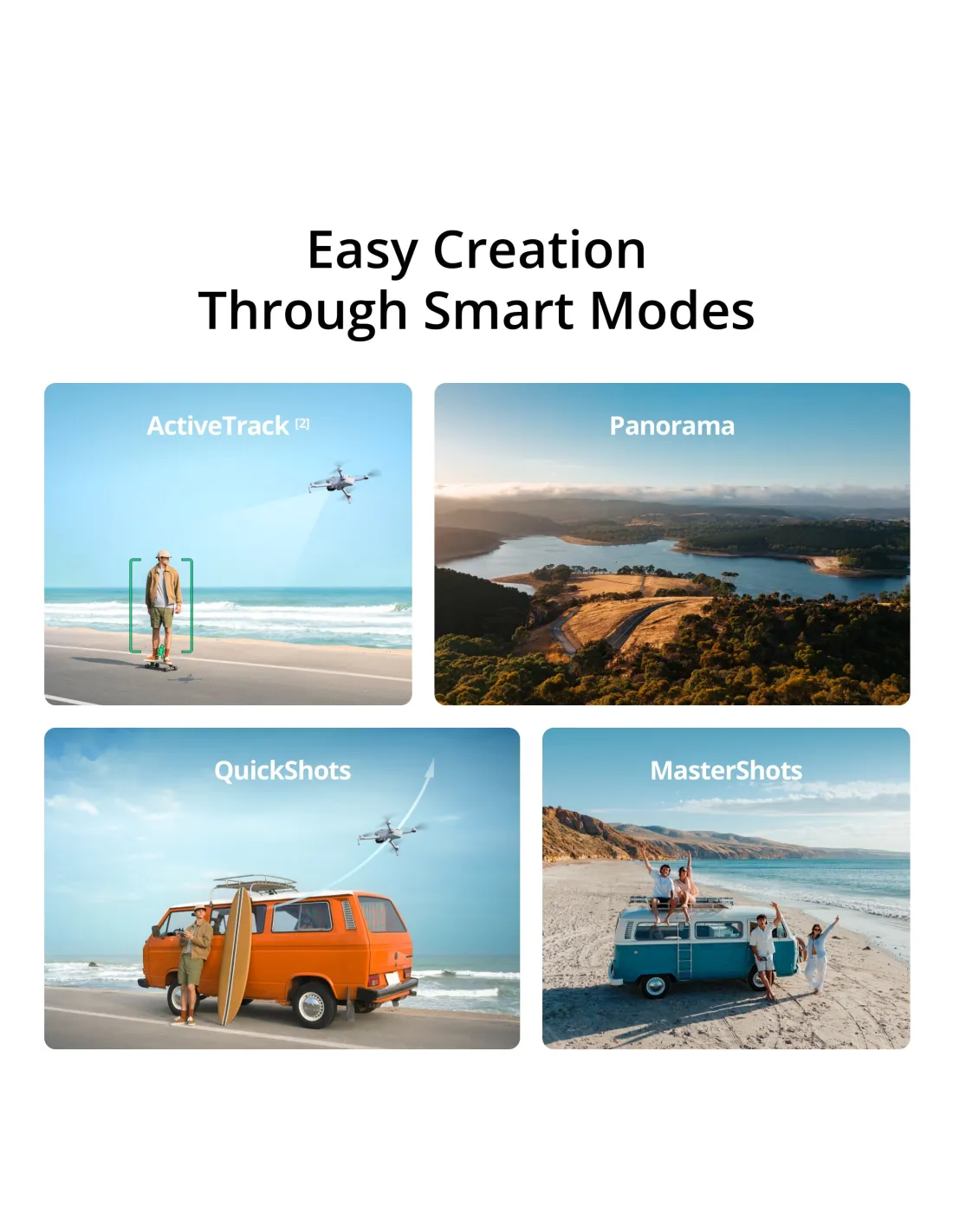 Dronas palaiko ActiveTrack, QuickShots, MasterShots ir kitus automatinius režimus, leidžiančius lengvai kurti profesionaliai atrodančius kadrus net be patirties.